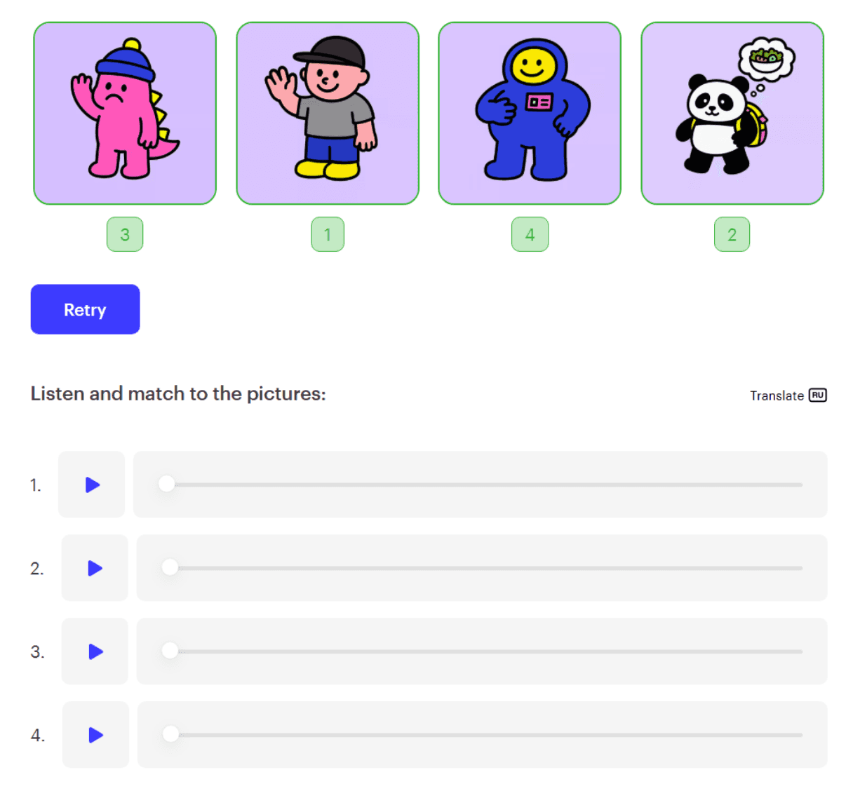 Все материалы на платформе озвучены, поэтому ребёнок с самого начала привыкает к английской речи, учится правильному произношению и развивает навык аудирования. Практика говорения начинается уже на первом занятии: дети повторяют слова и фразы, отвечают на простые вопросы и постепенно начинают говорить самостоятельно. Это помогает преодолеть языковой барьер и почувствовать уверенность в своих силах.