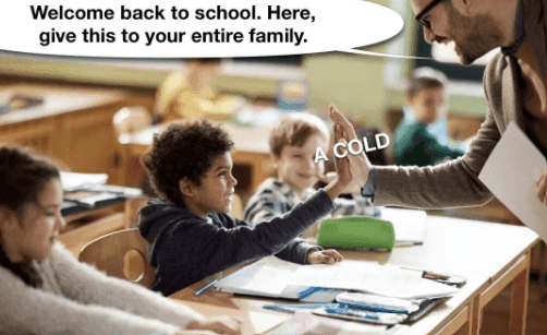 «Welcome back to school. Here, give this to your entire family». = «Добро пожаловать обратно в школу. Вот, передай это всей своей семье» (подпись: «A cold» = «простуда»).