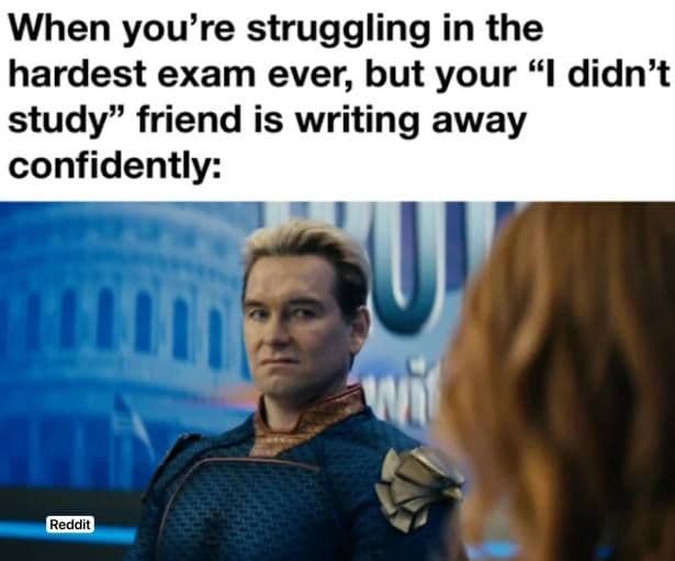Мем играет на типичной ситуации среди многих школьников и студентов: одни жалуются, что не готовились, а потом пишут лучше всех. Кадры из сериала The Boys усиливают сарказм.