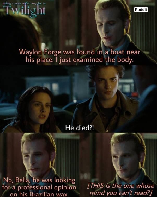 Carlisle: «No, Bella, he was looking for a professional opinion on his Brazilian wax» Carlisle thinking: «[This is the one whose mind you can’t read?]»