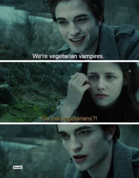 Другой мем о фильме обыгрывает сцену, где Эдвард рассказывает о «диете» своей семьи. В фильме «вегетарианство» Калленов означало отказ от человеческой крови в пользу животной.