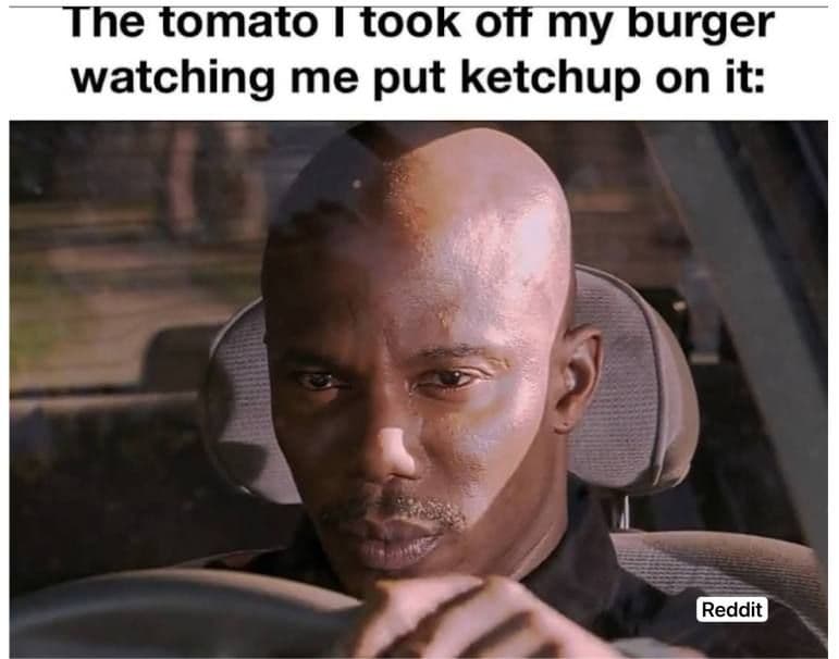 Комизм именно в этом меме строится на лицемерии: человек не хочет есть цельный помидор, но ест его же в переработанном виде.