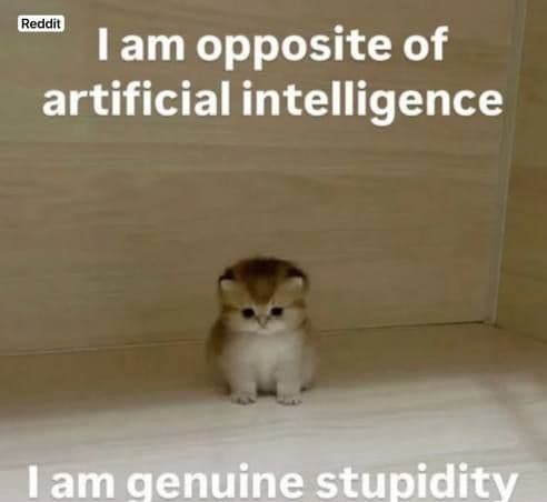 Очень многие мемы посвящены ИИ — особенно тому, какие люди глупые на его фоне. Мем с котёнком — это как раз самоирония пользователей и игра слов, где вместо artificial используется genuine, а вместо intelligence — stupidity.