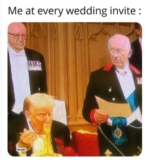 Часто мемами становятся политические события — как, например, визит президента США Дональда Трампа в Великобританию. Особенно вирусным стало фото Трампа во время ужина в Виндзорском замке: американский лидер уплетает макароны, а британский король Карл III стоит рядом с озадаченным лицом.