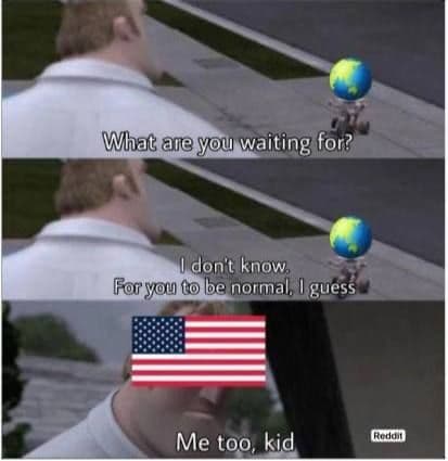 Мем использует отсылку к сцене из мультфильма «Суперсемейка», где один из персонажей общается с мальчиком. Здесь это переделано в саркастический диалог Земли и США: мир ждёт, что Америка будет «нормальной», но и сама Америка этого хочет.