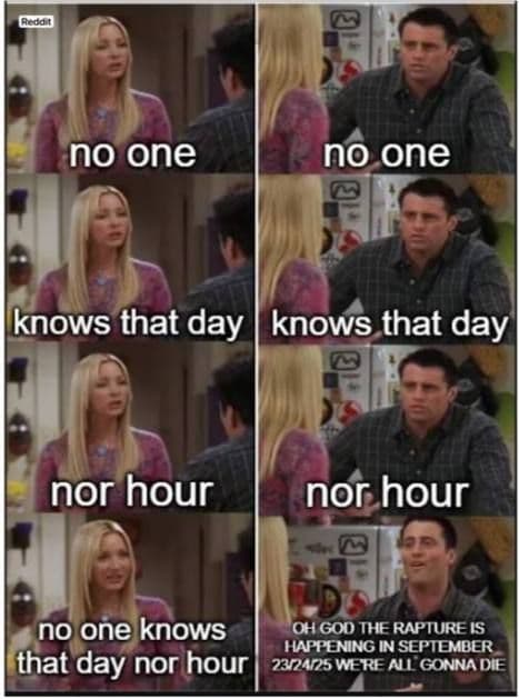 На этом меме — кадр из сериала «Друзья». Герои пошагово повторяют части фразы, пока Джоуи не пугается, что конец света назначен на сентябрь (тот самый день Восхищения).