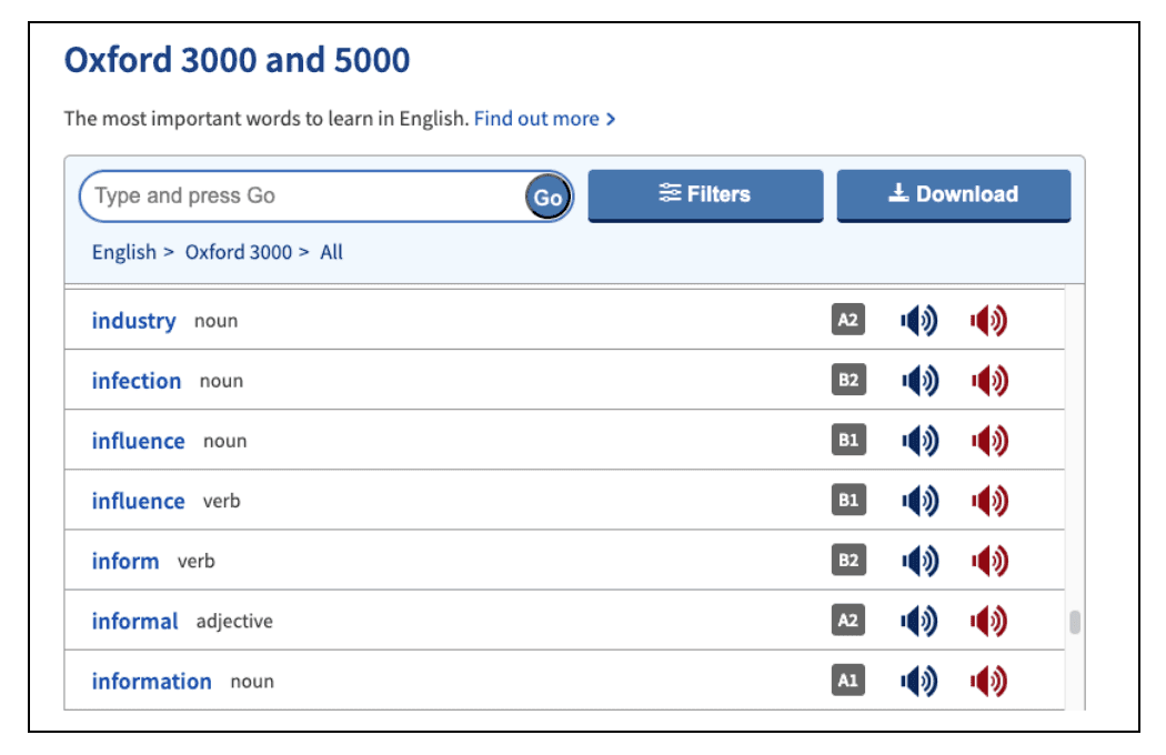 Полезный бонус: на этом же сайте есть Oxford 3000 и Oxford 5000 — список из, соответственно, 3 и 5 тысяч самых важных слов английского, которые чаще всего встречаются в текстах на знание языка. Это отличный ресурс, чтобы подготовиться: слова можно фильтровать по нужному уровню (от A1 до C1) и послушать их произношение в британском и американском английском.